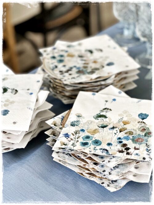 …fallegar servéttur með blómum í bláum og alls konar litum…