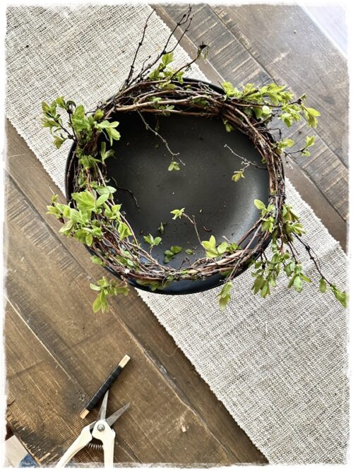 …ég sótti mér greinar í garðinn og gerði einfaldan krans í skálina…