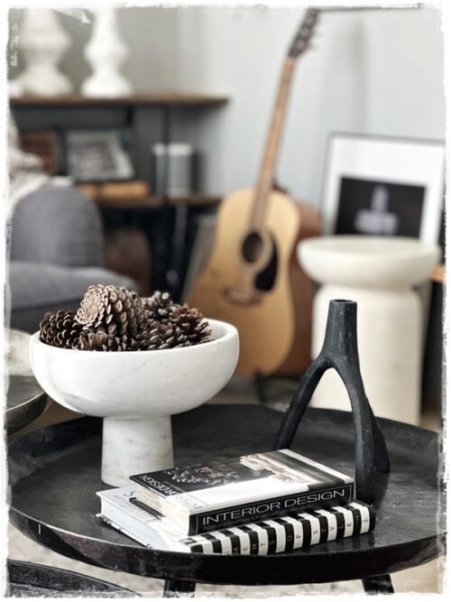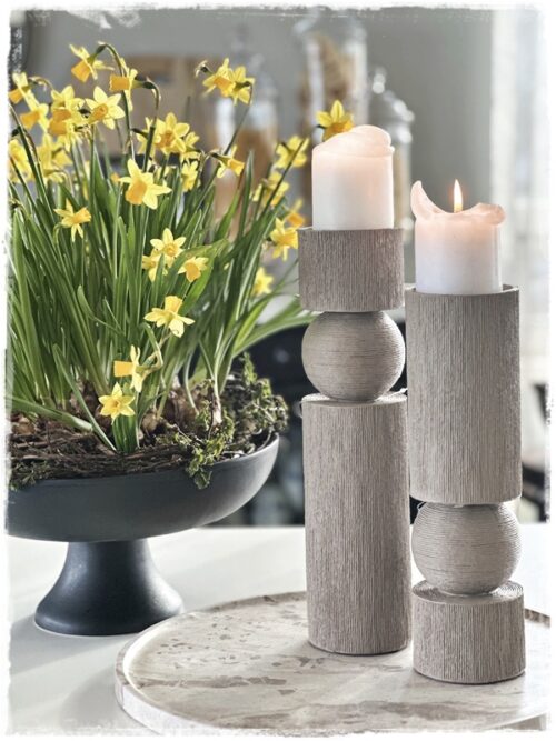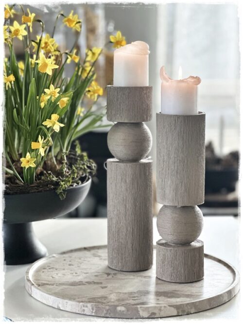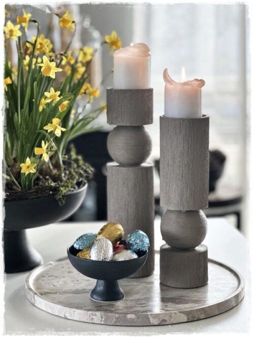 …svo prufaði ég að færa hana á eyjuna, og setti með þennan geggjaða marmarabakka og kertastjakana. Stjakana er hægt að nota bæði fyrir mjó kerti og fyrir kubbakertin…