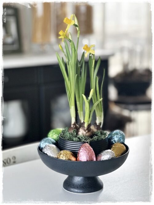 …og ég setti lítinn pott með páskalilum í skál og ofan í miðskálina og egg í kring…