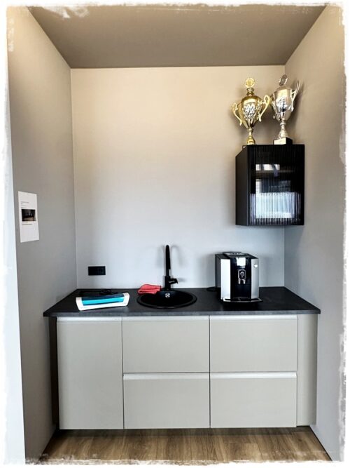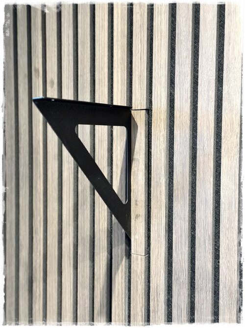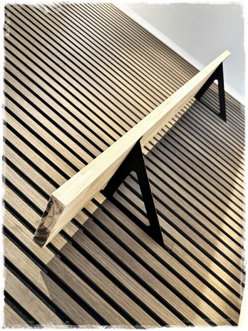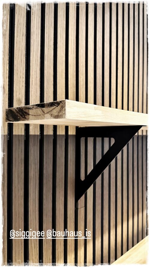 …settum sem sé panilinn í bakið og fyrst ætluðum við að vera með svartar hillur – en við komumst svo að því að þær héldu alls ekki þeirri þyngd sem þurfti – sem betur fer! Enduðum með hillubera sem gætu nánast haldið 100kg og tók gegnheila eikarborðplötu og söguðum hana niður í rétta breidd. Við söguðum úr panilinum til að koma fyrir hilluberanum og límdum hann svo aftur á sinn stað..