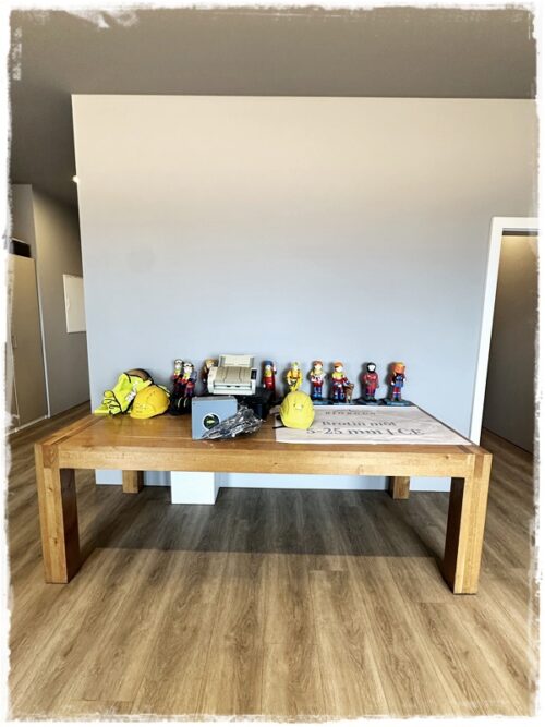 …við einn vegginn stóð gamalt borð sem hafði áður verið í fundarherbergi en átti bara að losa út en við ákváðum að endurnýta það…