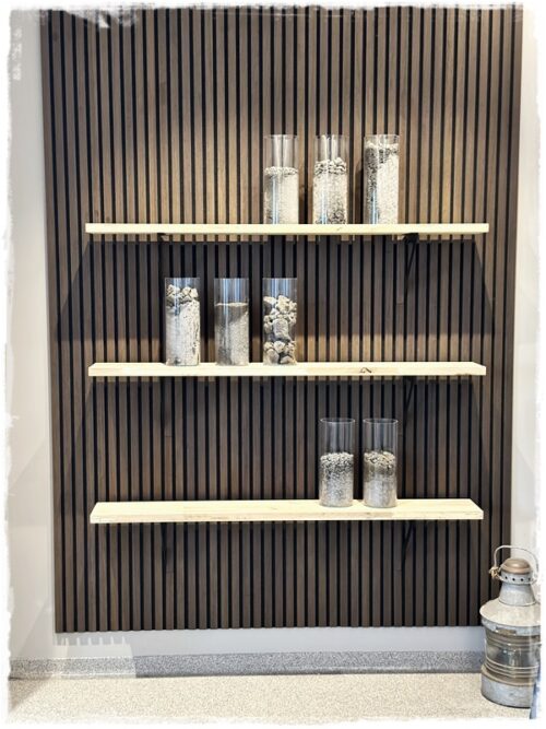 …og á vegginn á móti panilinum settum við upp tvær hillur til viðbótar, til að tengja við viðinn og setja smá hlýleika…