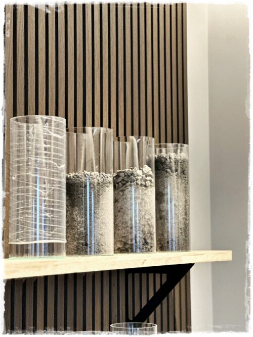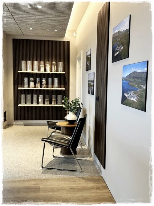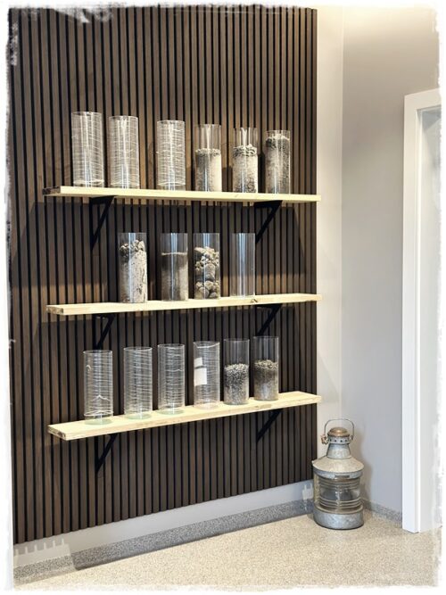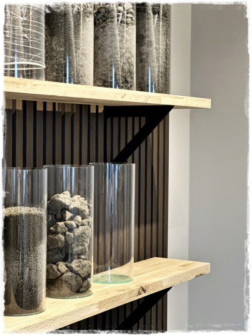 …eitt af stóru málunum sem við þurftum að leysa var að útbúa hillur sem geyma vasa sem eru með sýnishornum af steinefnum. Hillurnar þurftu því að vera sterka og geta haldið góðri þyngd. Hér er veggurinn fyrir…