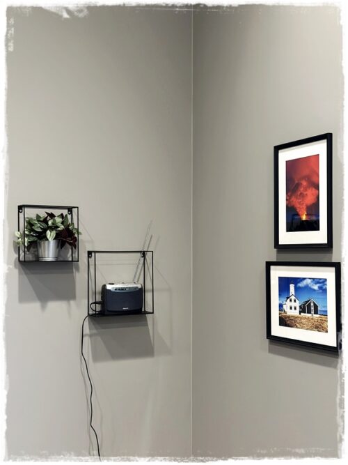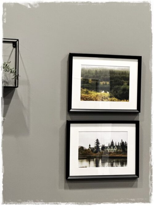 …síðan settum við litlar hillur og myndir á veggina, sem ég verslaði í Góða hirðinum…