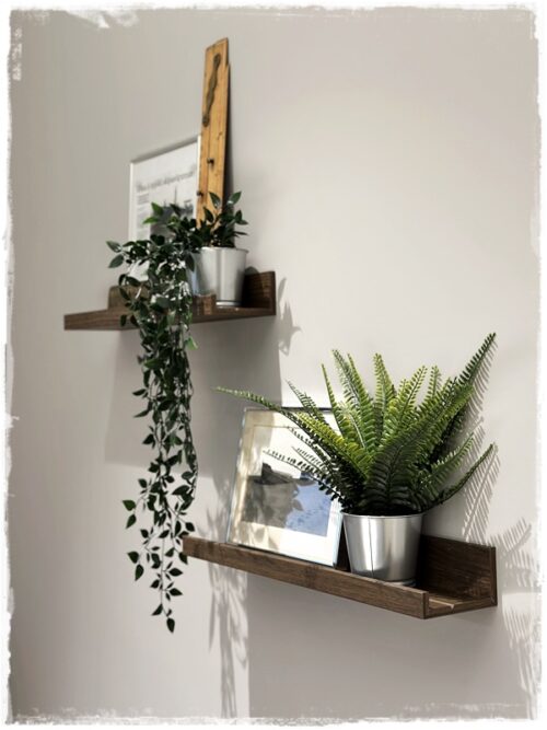 …notaði síðan hnotu vegghillur frá Ikea til þess að setja á ramma og smá blóm, til þess að ná inn græna litinum…