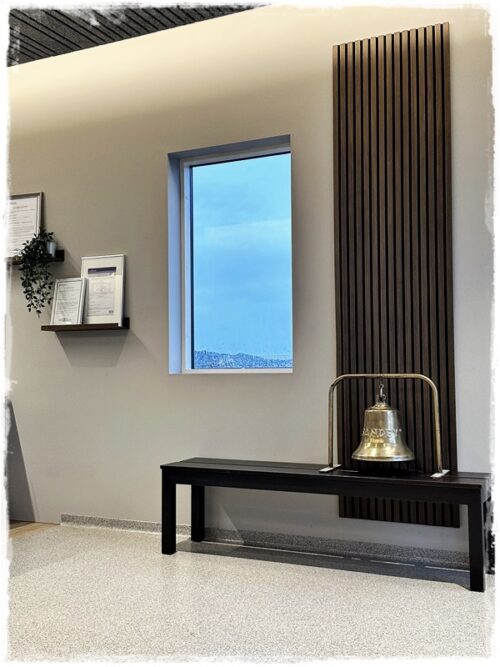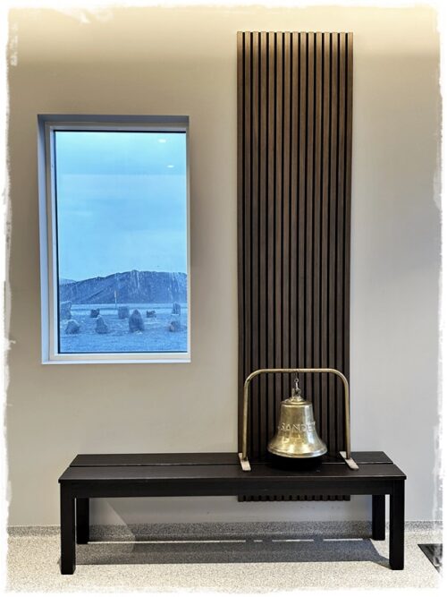 …gamla skipabjallan fékk síðan heiðurssess á bekknum, svo að fleiri fái notið hennar…