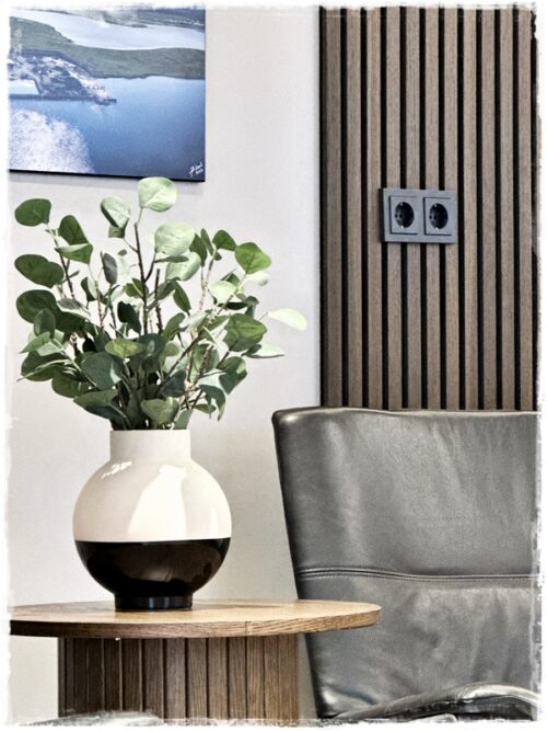 …við notuðum sömu stólana, en ég keypti æðislegt hliðarborð í Húsgagnahöllinni, sem harmoneraði svo fallega við panilinn. Þið sjáið líka að panillinn “felur” innstunguna..