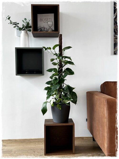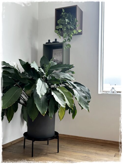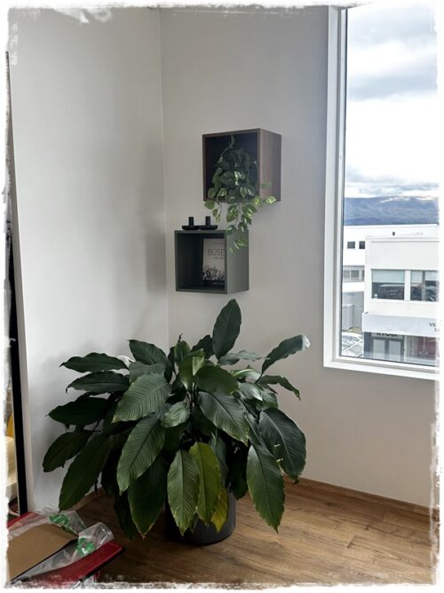 …það var alveg risastór friðarlilja sem stóð á gólfinu og mig langaði að lyfta henni aðeins, þannig að ég keypti ódýrt blómaborð í Ikea og við styttum það bara…