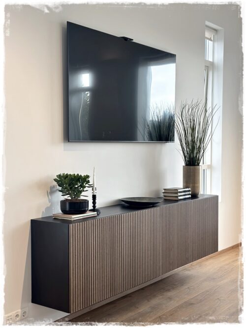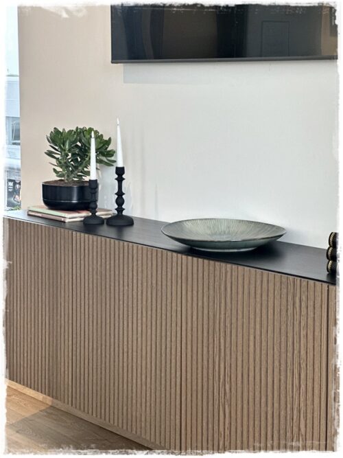 ….það var mjög fallegur skenkur inni í matsalnum en vantaði meira geymslupláss, þannig að við keyptum Bestaskápa með fallegum viðarhurðum og fengum þannig hellings pláss…