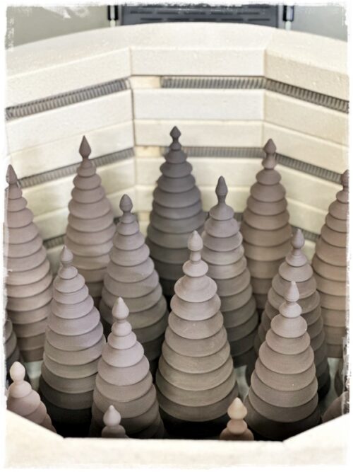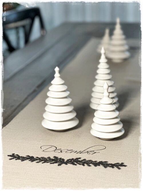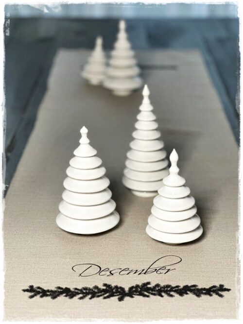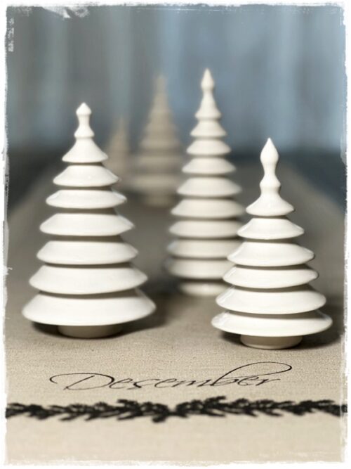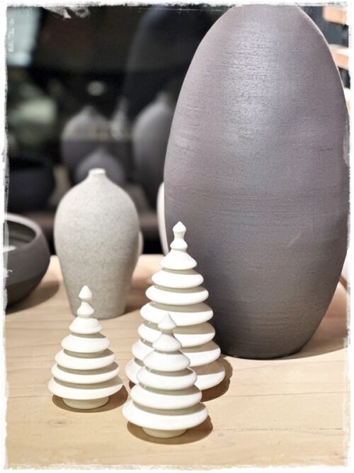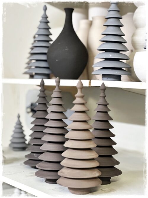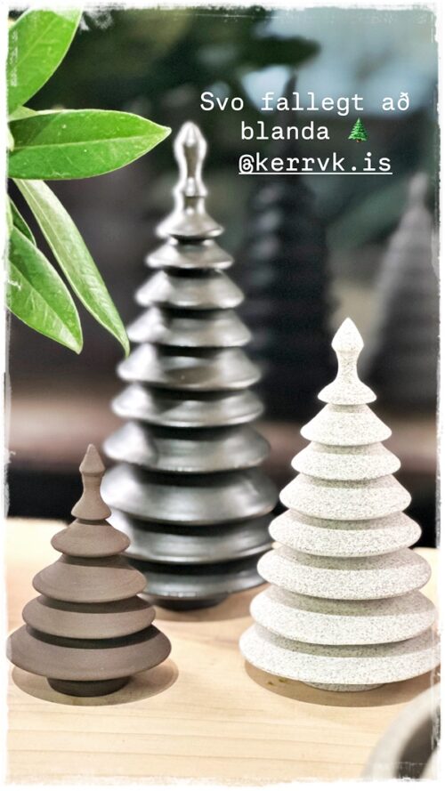 …jólatrén eru gerð ýmist úr steinleir eða postulíni. Koma því í mismunandi áferðum: glansandi hvít postulínstré og mött hvít, svört glansandi steinleirstré, mött brúnleit steinleirstré og svo öskutrén, sem koma í yrjóttri áferð…