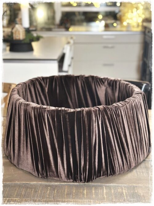 …og eins tók ég jólatréskörfuna og klæddi hana upp á nýtt með brúnu velúrefni – er mjög ánægð með þá útkomu…