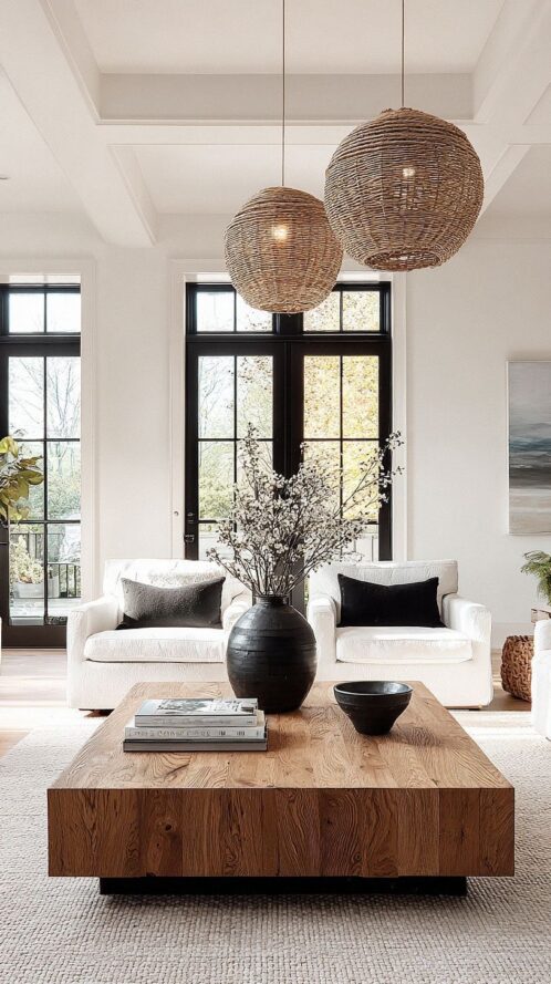 Viður, keramik, textíll og plöntur eru lykilatriði.
