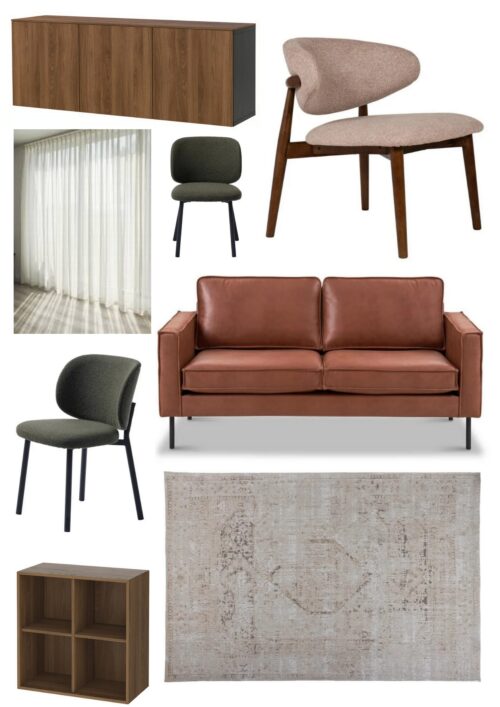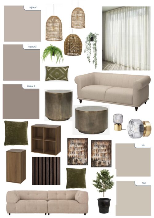 Fyrsta moodboardið sem við vorum að skoða var á þessa leið, því við vorum svo mikið að hugsa létt og ljóst. En fljótlega urðum við sammála um að ljósir sófar og mikil umgegni væri eflaust ekki gott plan til lengri tíma litið.