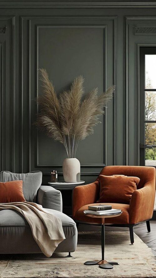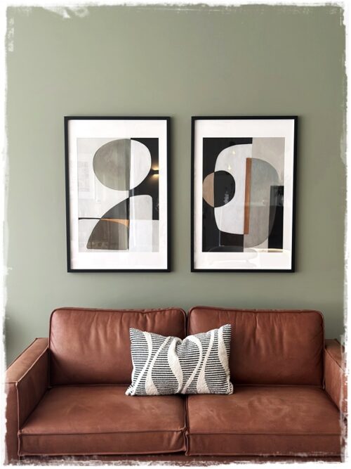 Þá sýndi ég henni þessar hérna tvær myndir – og það er alltaf svo frábært að finna svona myndir sem tala til manns. Það er ekkert verið að gera eins, heldur er þetta innblástur og sýnir svolítið tilfinninguna sem maður er að leita eftir. Við fórum því í grænan lit á valda veggi og að finna leðursófa í koníakslit…