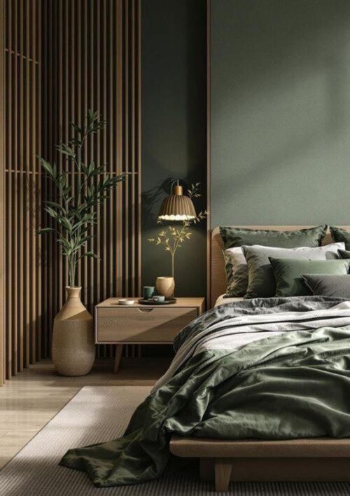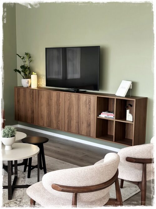 og úr varð að mála veggina í setustofunni í fallegum grænum lit en restina í mjúkum beige tón…