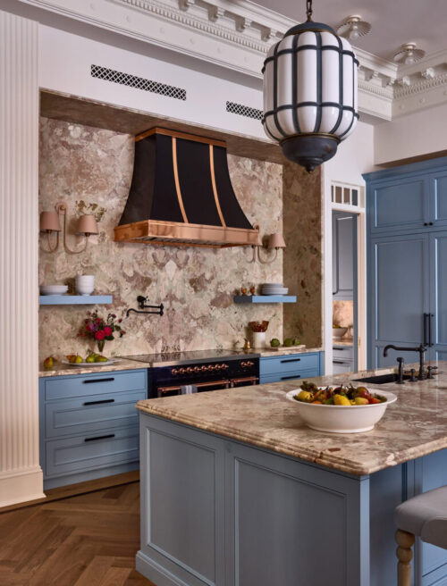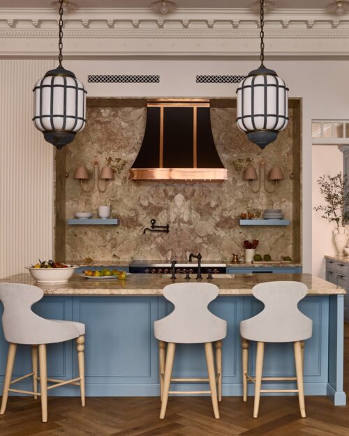 …lofthæðin er alveg 4,5m í íbúðinni, og þau vildu endurskapa gamlan sjarma og tekst það vel til í eldhúsinu…