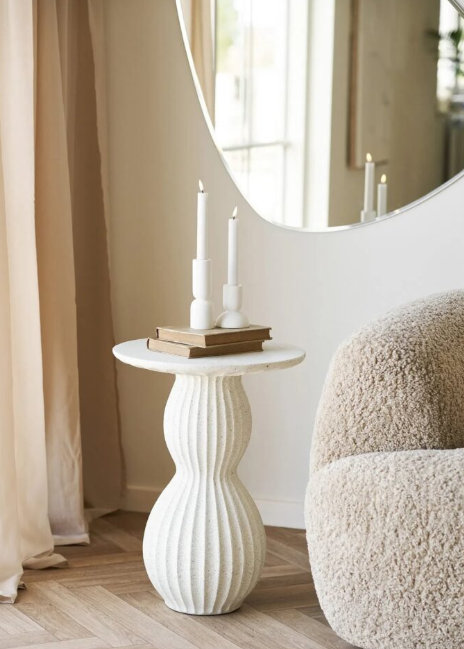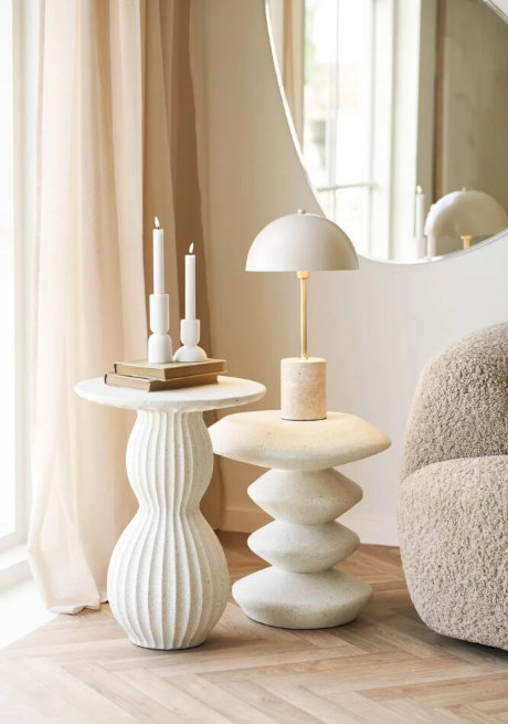 …ok ég ELSKA þessi tvo hliðarborð/blómasúlur eða hvað við viljum kalla þau. Svo ótrúlega falleg og gætu gengið sem lítil náttborð líka. Svo er þessi marmaralampi alveg draumur!
